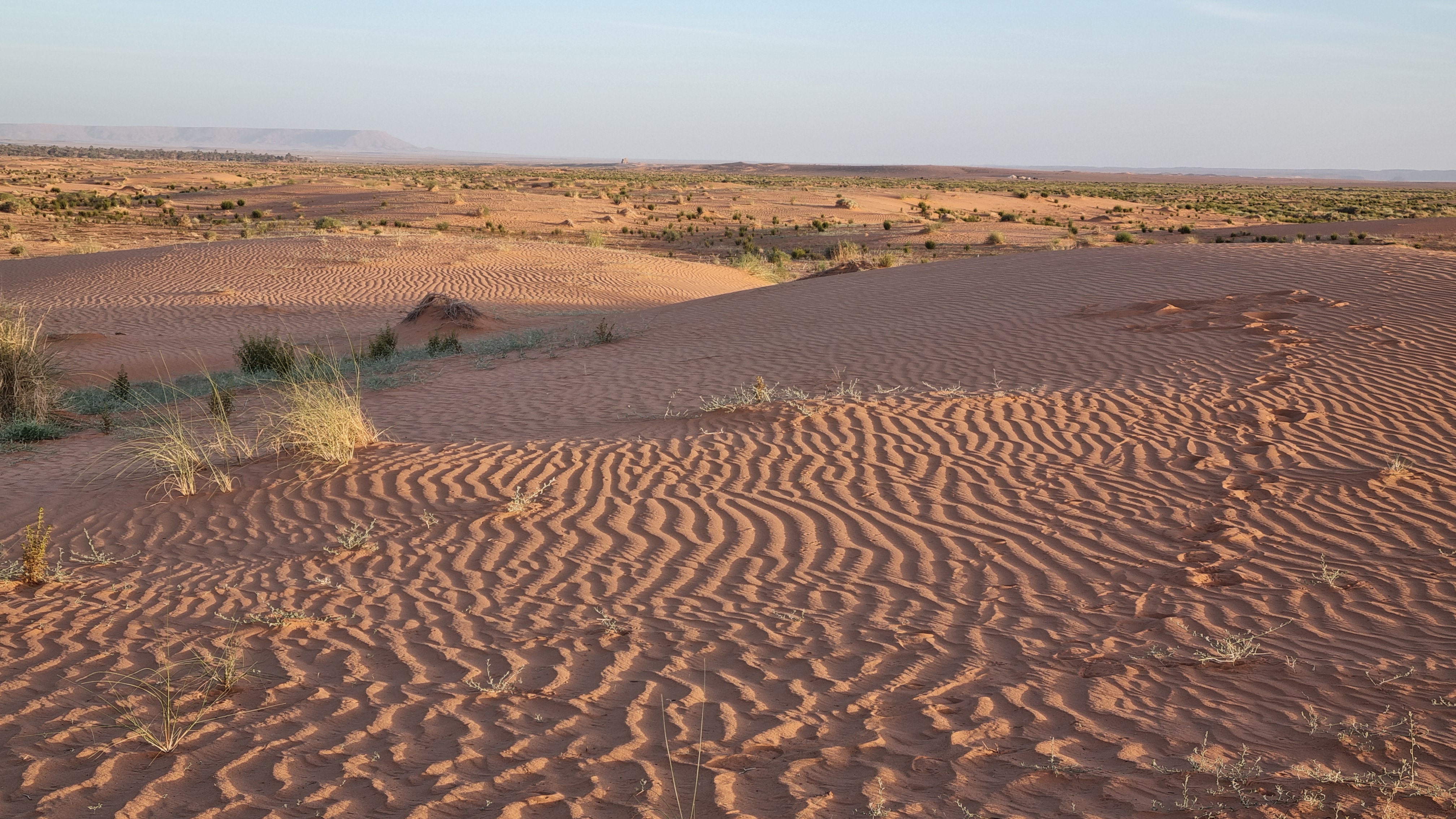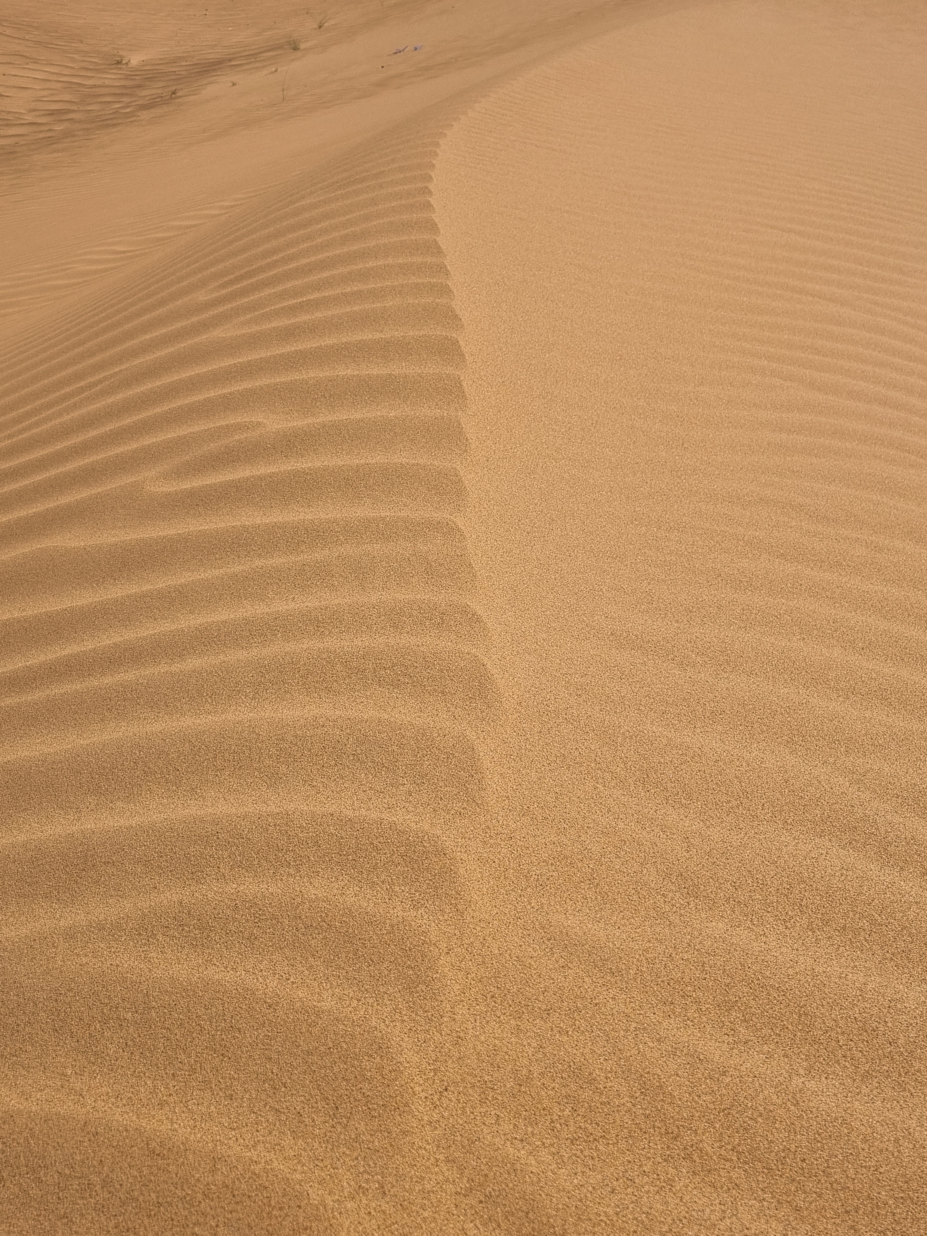 Je vis les dunes oranges et roses immobiles, l’ombre de leur masse mouvante sous la course du soleil, la poussière soulevée par le vent brouillant la droite impeccable de la ligne de crête, les vagues sèchent sur le versant des ondes de l’horizon