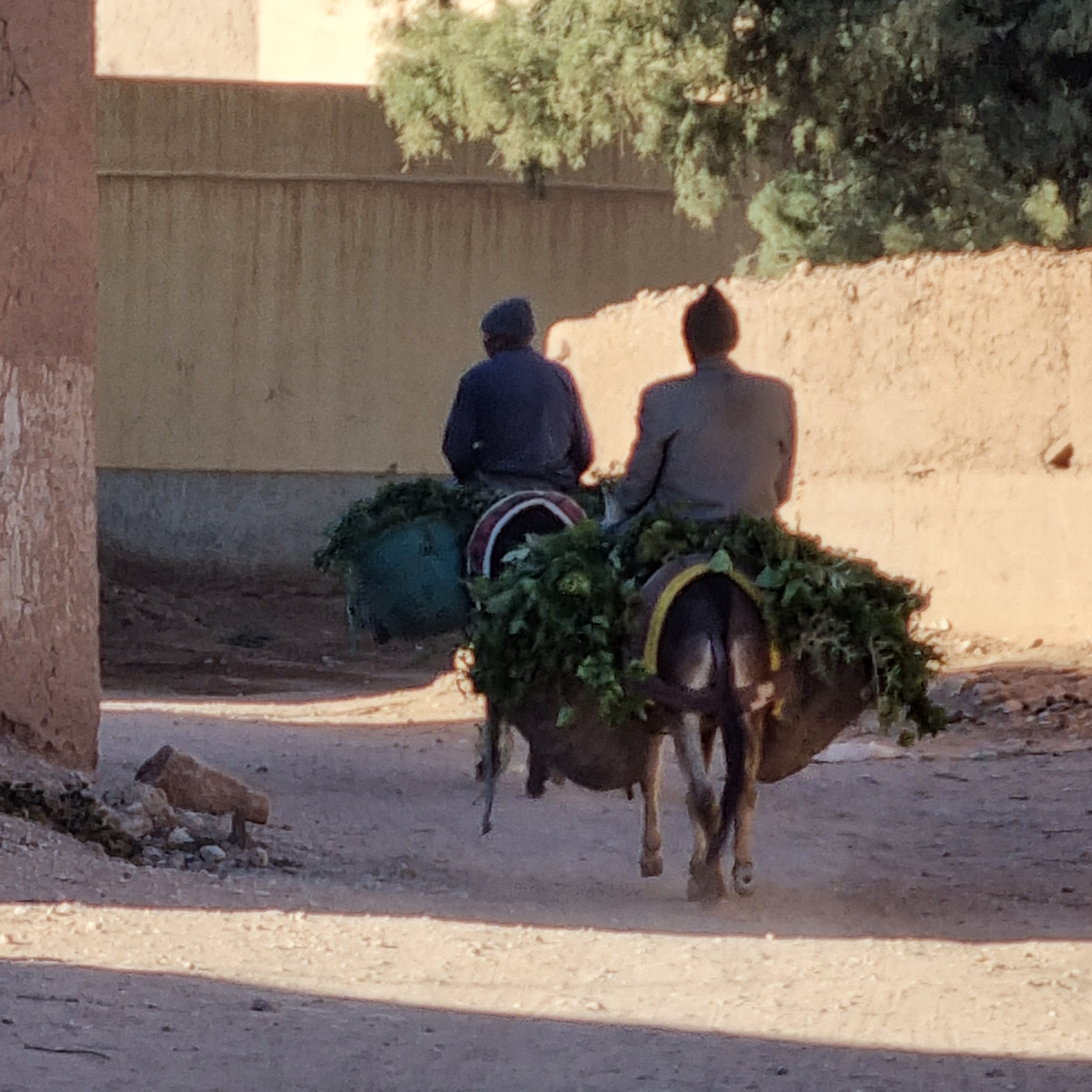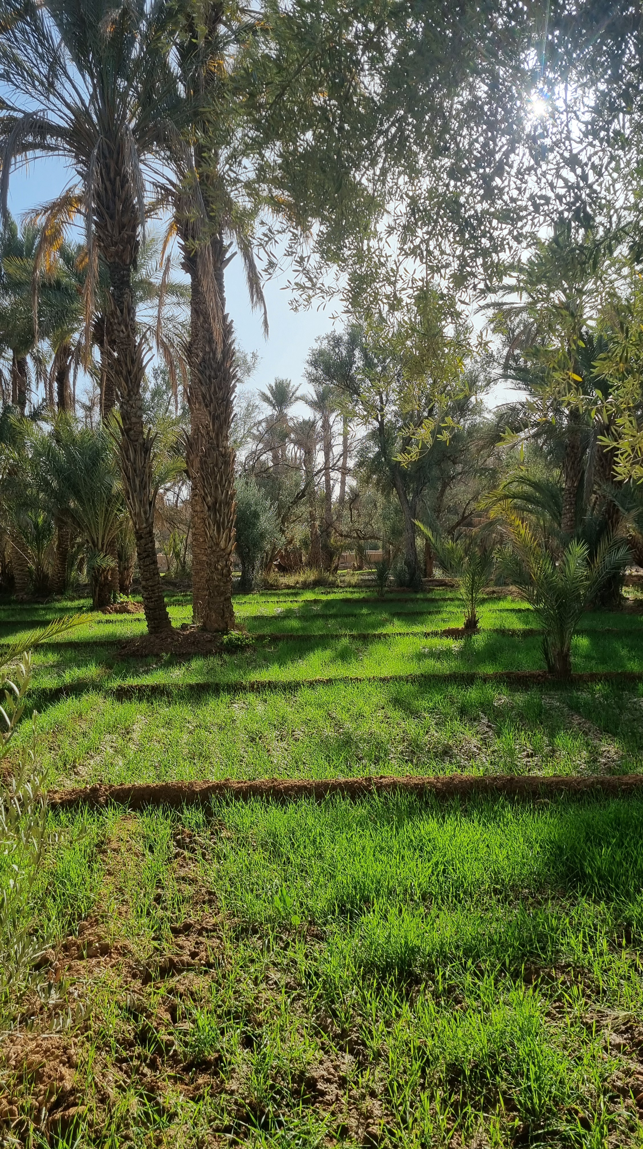 Je vis les rayons du soleil jouer dans la palmeraie avec le vert intense des pousses de luzerne