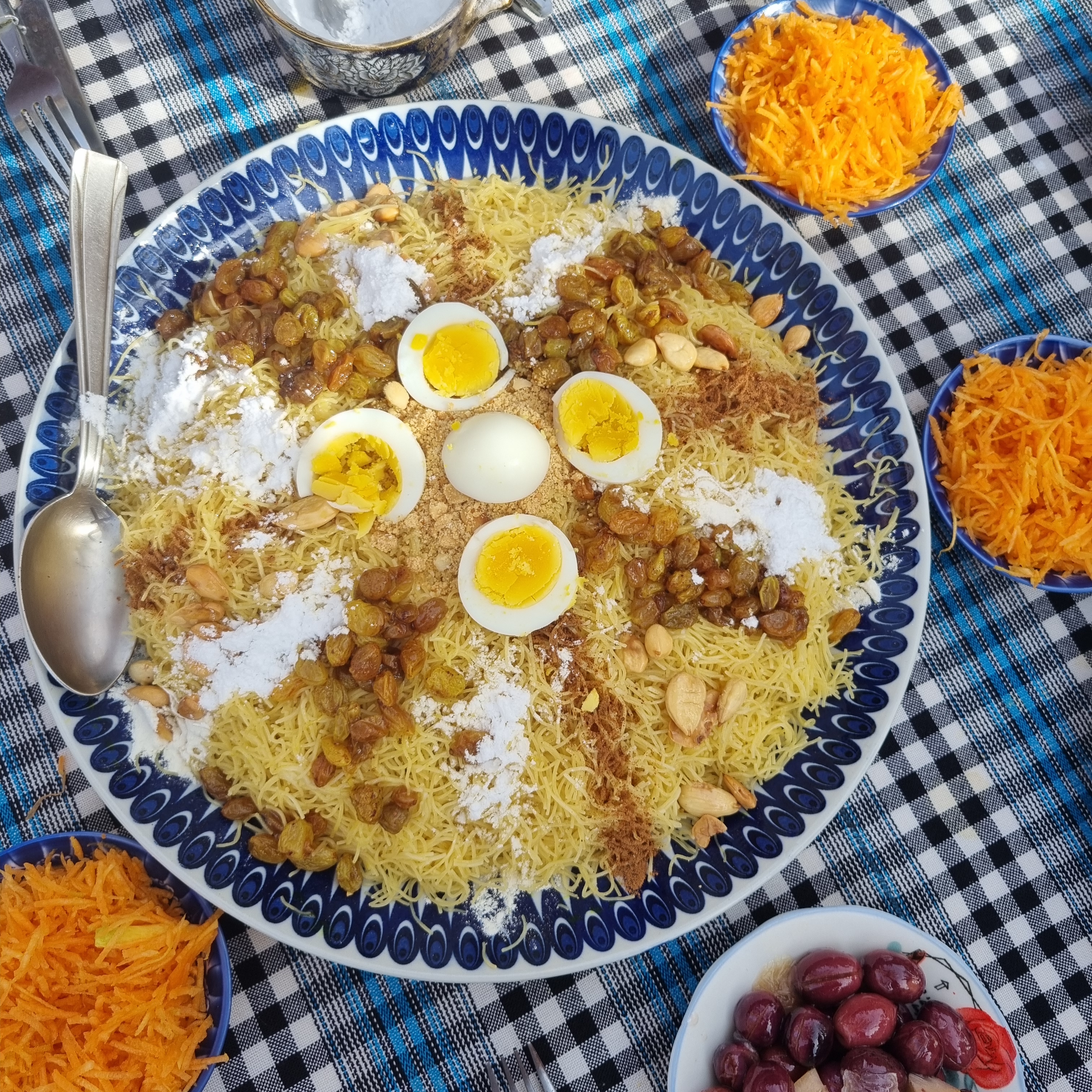 Je vis le repas, la polychromie de l’émail des céramiques magnifier les mets chamarrés posés sur les tapis de fêtes, ta famille réunie bénir le repas et s’en régaler dans la joie, le mendiant à ta porte entrer pour prendre part au festin